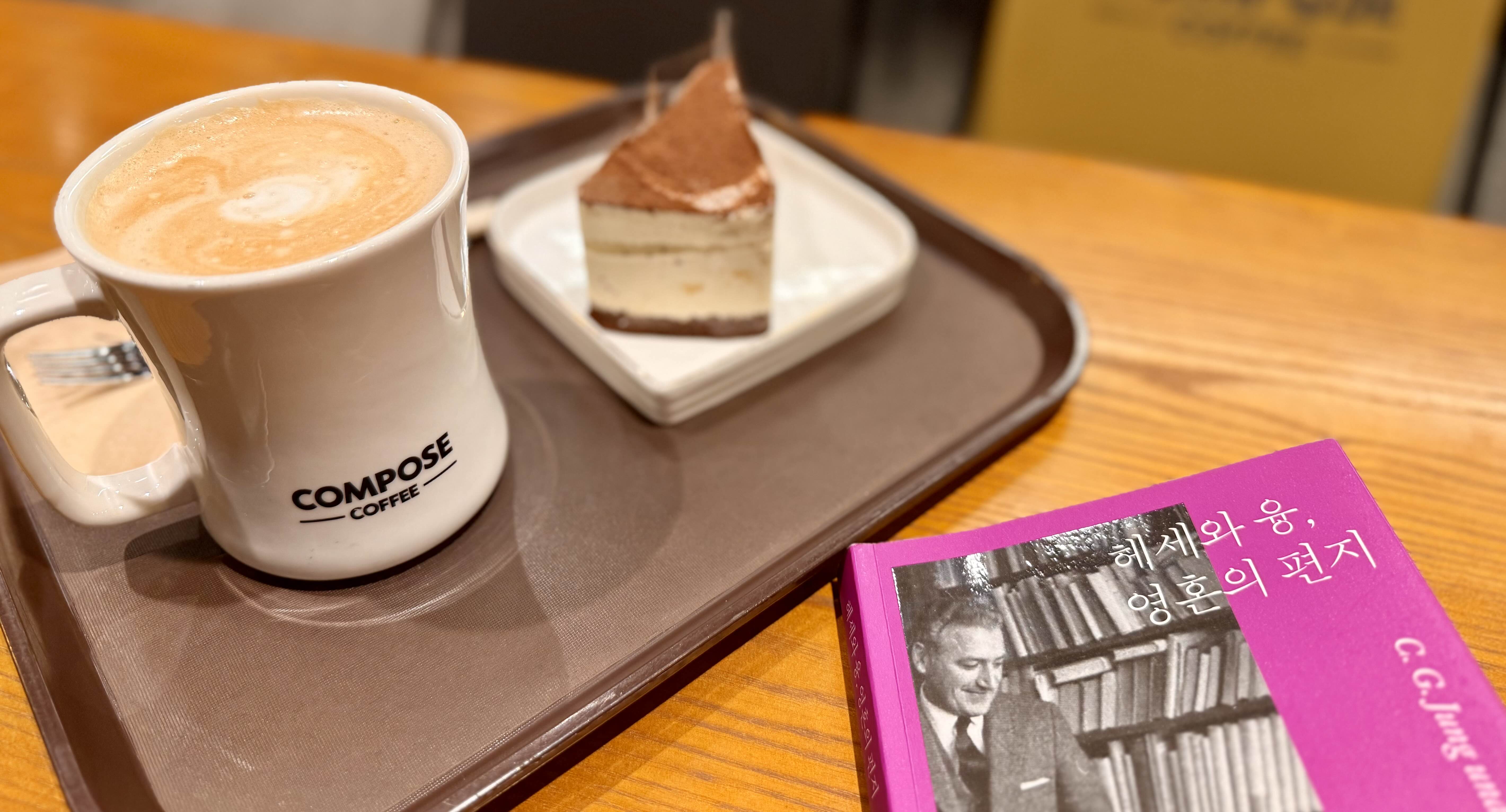 근처 컴포즈 커피에 가서 라떼와 티라미수를 저녁으로 먹으며 독서를 이어나갔다.